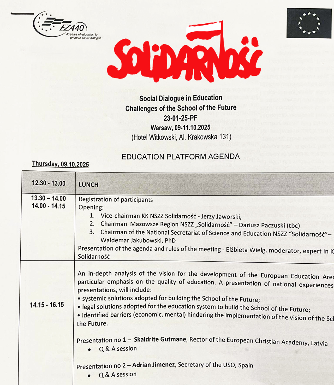Varšavā, 2025. gada 9.-11. oktobrī notika Eiropas Centra Strādājošo Jautājumos (EC-EZA) konference “ “Sociālais dialogs izglītībā: nākotnes izglītības izaicinājumi ES”, analizējot skolu un augstskolu attīstības tendences. Prognostiskajā skatījumā un domu virzienā piedalījās izglītības politikas veidotāji, valdības un izglītības speciālisti no Polijas, Portugāles, Spānijas, Albānijas, Vācijas un citām ES valstīm. Eiropas Kristīgās Akadēmijas rektore prof. Skaidrīte Gūtmane plenārsēdē referēja par pašreizējiem un iespējamajiem sistēmiskajiem risinājumiem izglītības nākotnes skolās.