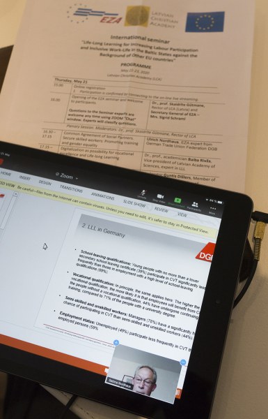 21.-23. maijā Kristīgā akadēmija sadarbībā ar Eiropas Komisijas tīklorganizāciju EZA (Eiropas Centrs Strādājošo Jautājumos, Vācija) vadīja starptautisku semināru par mūžizglītības jautājumiem saistībā ar nodarbinātību Baltijas valstīs un Eiropā. Ņemot vērā ierobežotās ceļošanas iespējas – atvērtas ir tikai Baltijas valstu robežas – tas notika attālināti, uz vietas piedaloties tikai kaimiņvalstu pārstāvjiem. Seminārā piedalījās akad., prof. Baiba Rivža, EK Ekonomikas un sociālo lietu komisijas loceklis Pēteris Krīgers, Pieaugušo izglītības centra direktore Sarmīte Pīlāte, Klaipēdas Universitātes prof. Elvīra Aciene, “The Golden League” vadītājs, politikas eksperts Aimars Altosārs (Igaunija), Vācijas Arodbiedrību savienības vad. Dr. Hans Ulrihs Nordhauss (Vācija), Dr. Agneška Pjasecka-Robaka Lejassilēzijas Universitāte, Polija). Semināra dalībniekus uzrunāja EZA ģenerālsekretāre Sigrīda Šramla (Vācija); semināru vadīja LKrA rektore, prof. Skaidrīte Gūtmane.